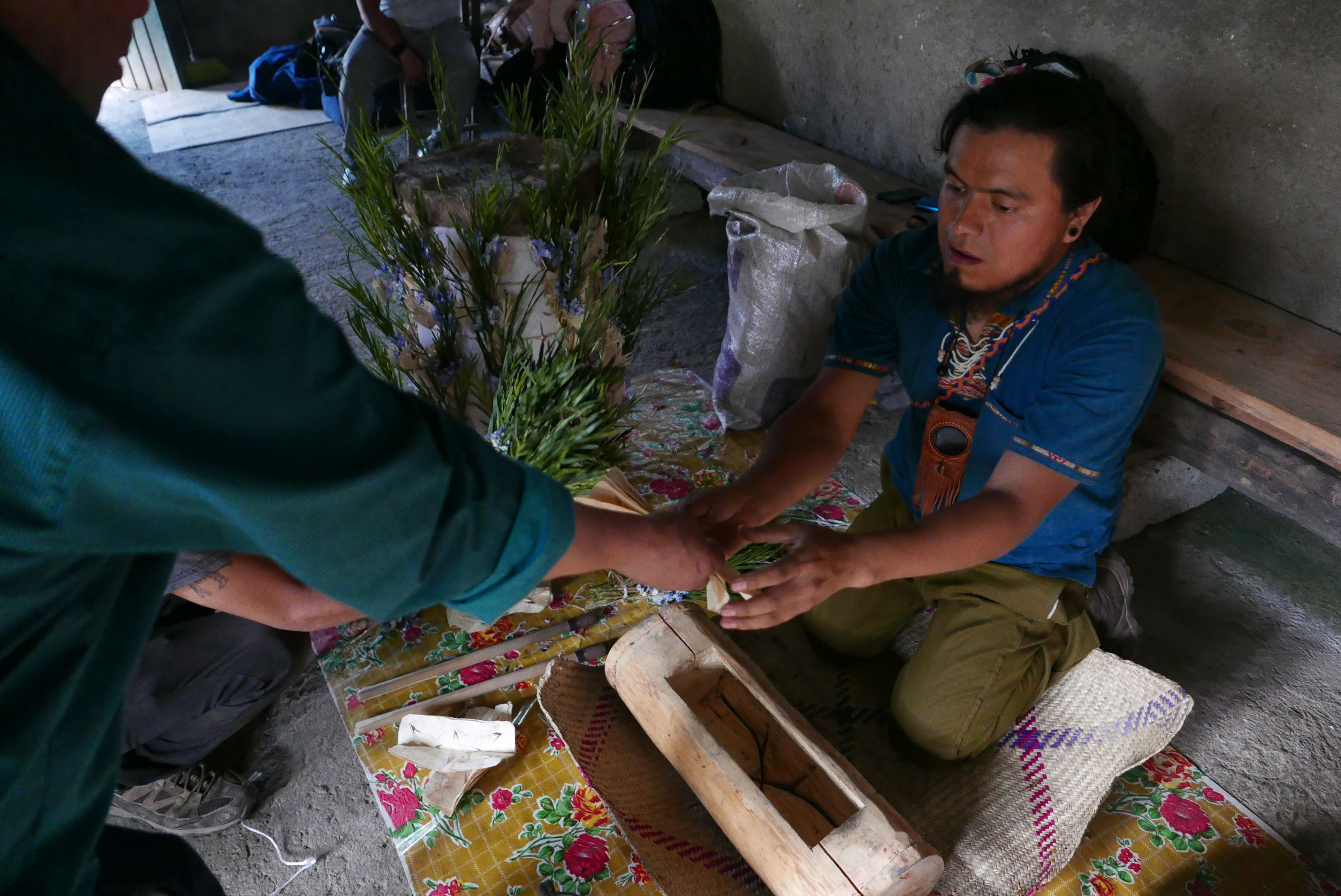 Fernando Ibarra Molina recibe del especialista ritual las nuevas figuras que se insertarán en el xilófono. Foto de Giulia Cantisani (2022)