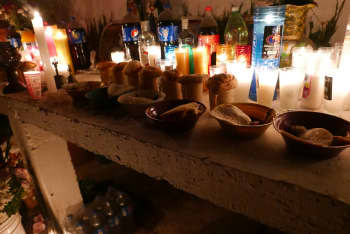 La noche del 2 de mayo se baila en el oratorio con las botellas de agua vestidas en los brazos y, en una cesta apoyada sobre la cabeza, se mece a los santos al son del xilófono y el tambor, acompañados por un trío de violín y guitarras. Sobre el altar y delante de los instrumentos se coloca una ofrenda de comida compuesta por mole, tortillas, atole de chocolate y pan, que a la mañana siguiente se repartirá entre los presentes en un momento de comensalidad entre los seres humanos y sus invitados invisibles.
