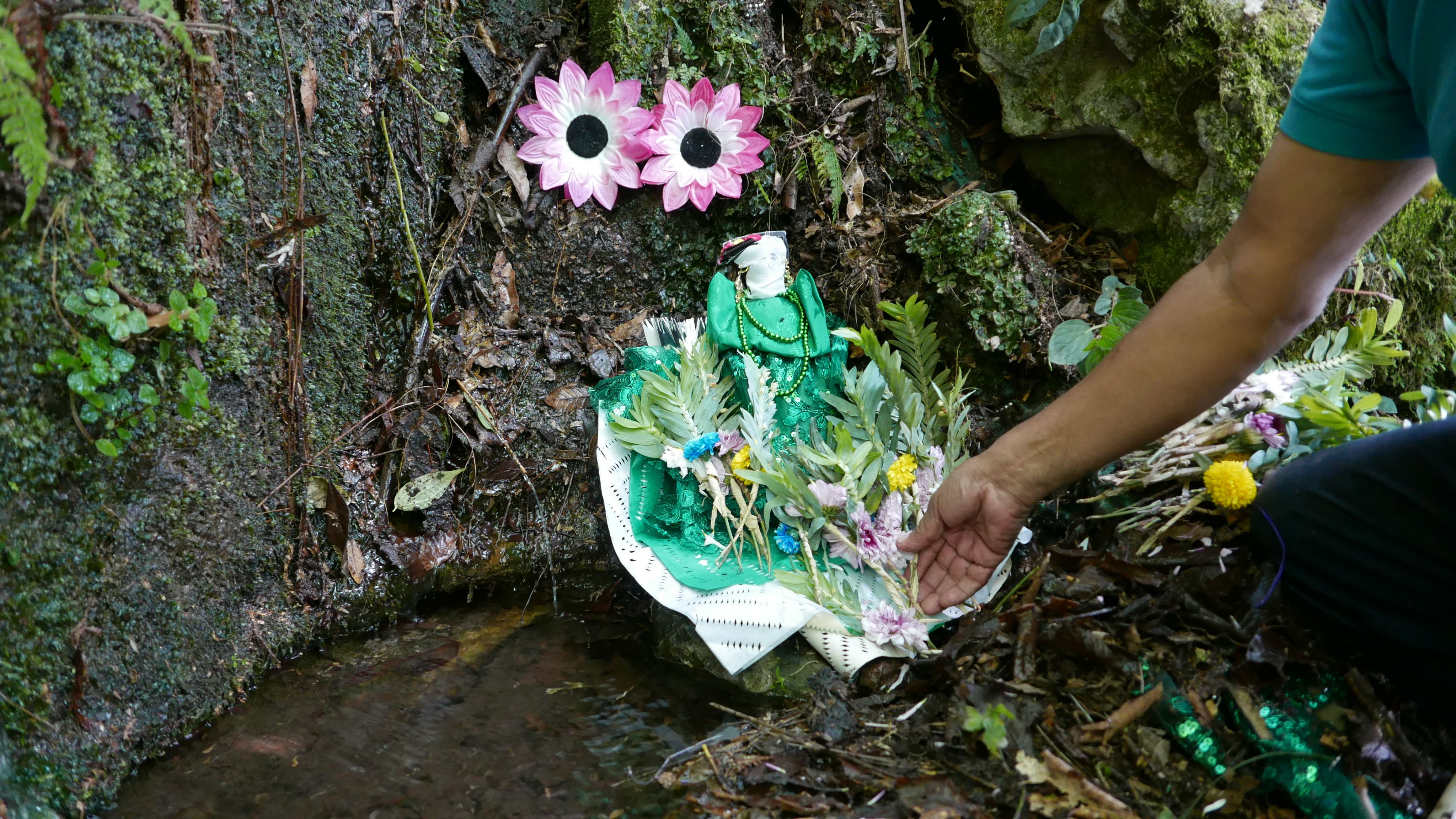 Figura de la entidad del agua vestida con su ofrenda de flores colocada cerca de un manantial. Foto de Giulia Cantisani (2025)