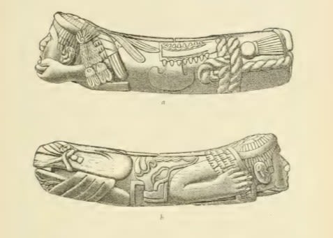 Dibujo del teponaztli prehispánico del guerrero de Tlaxcala conservado en el Museo Nacional de Antropología de la Ciudad de México, publicado en Saville, M.H. 1925. The wood-carver’s art in ancient Mexico. New York: Museum of the American Indian, Heye Foundation, p.63