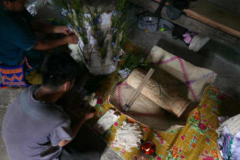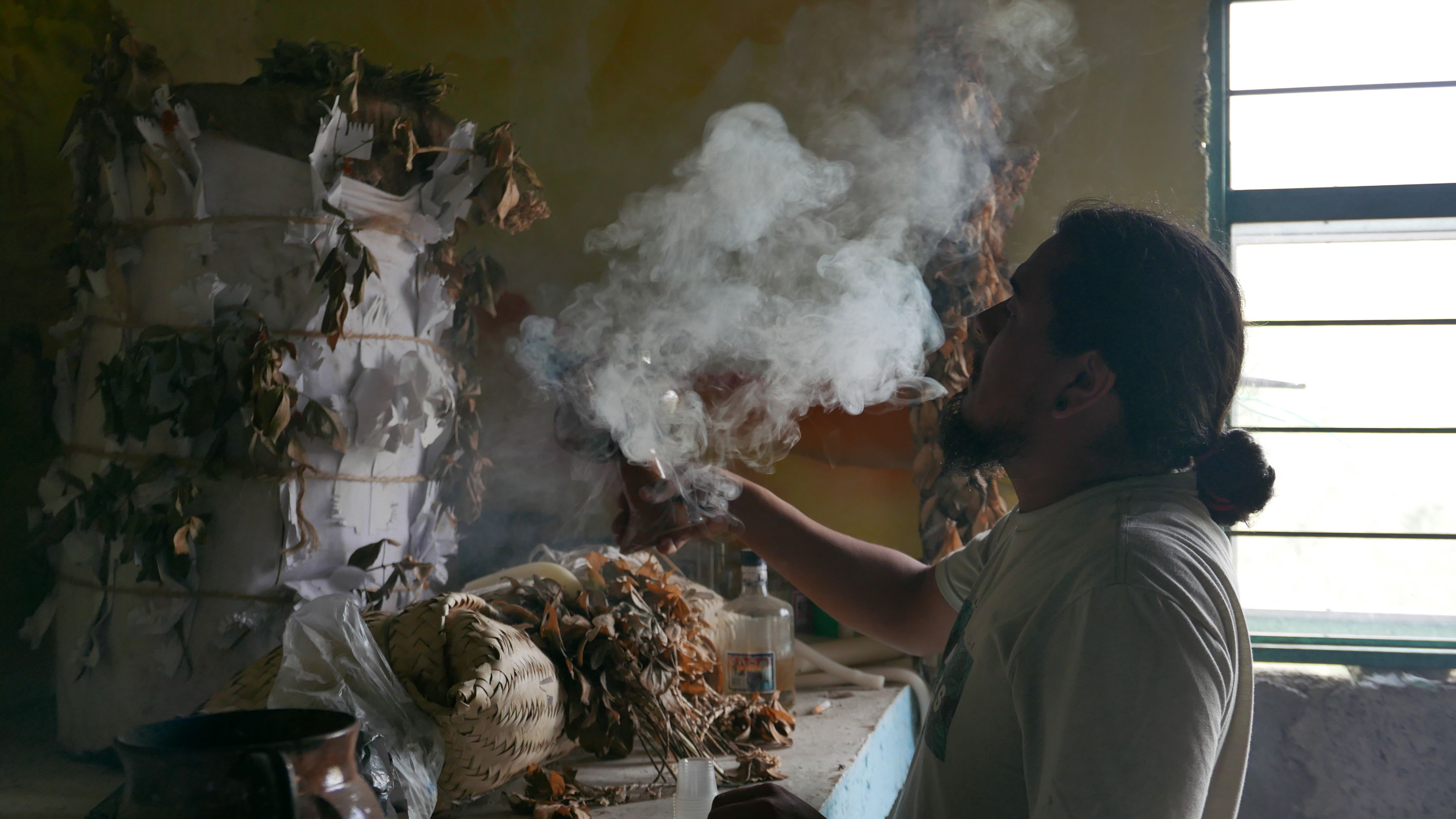 El especialista ritual convoca a las entidades creando figuras antropomórficas de papel para ofrecérselas como receptáculos: cuerpos efímeros que permiten a los espíritus estar presentes en la dimensión humana, experimentando la fragancia del incienso, los alimentos y el placer de la música y la danza que se les ofrece.