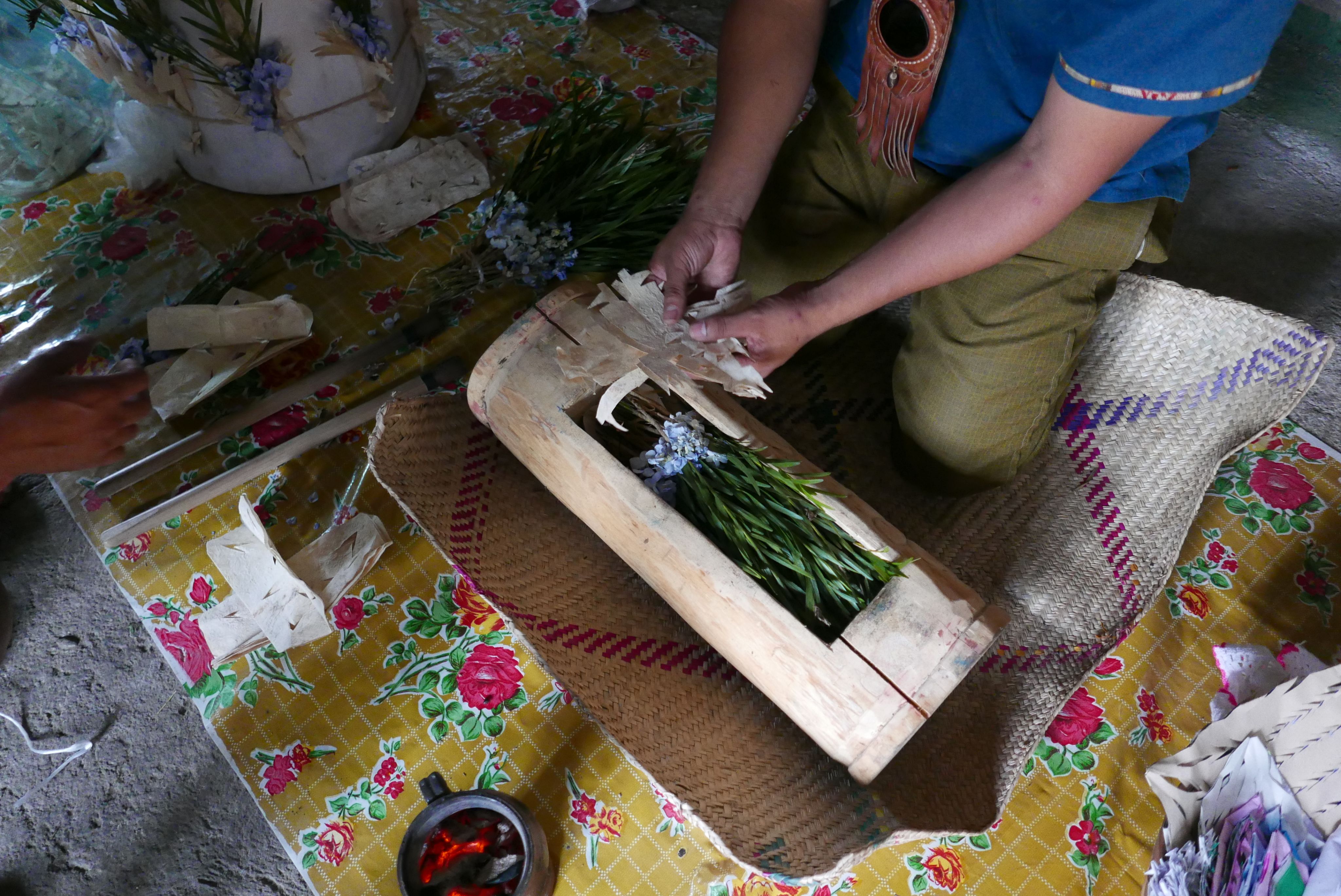 Tras un acto de purificación —destinado a evocar y alejar las influencias nefastas— el especialista prepara una multiplicidad de imágenes diferentes por color, forma y tipo de papel que se activarán con unas gotas de sangre de ave, en una operación llamada bendición, y posteriormente se distribuirán en diferentes puntos del espacio ritual que va desde el oratorio hasta la cima de la montaña, dibujando una geografía animada.