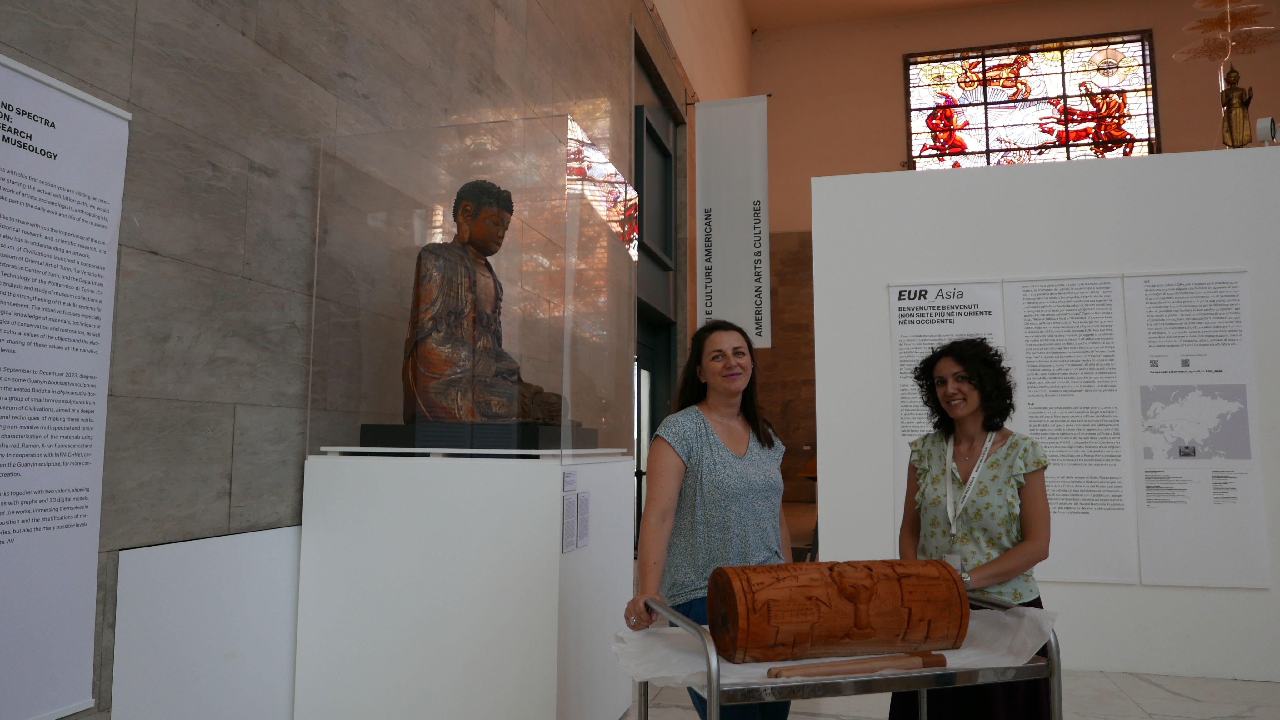 La conservadora Camilla Fratini y la Dra. Valeria Bellomia a la llegada del xilófono al MUCIV - Museo delle Civiltà - Roma.