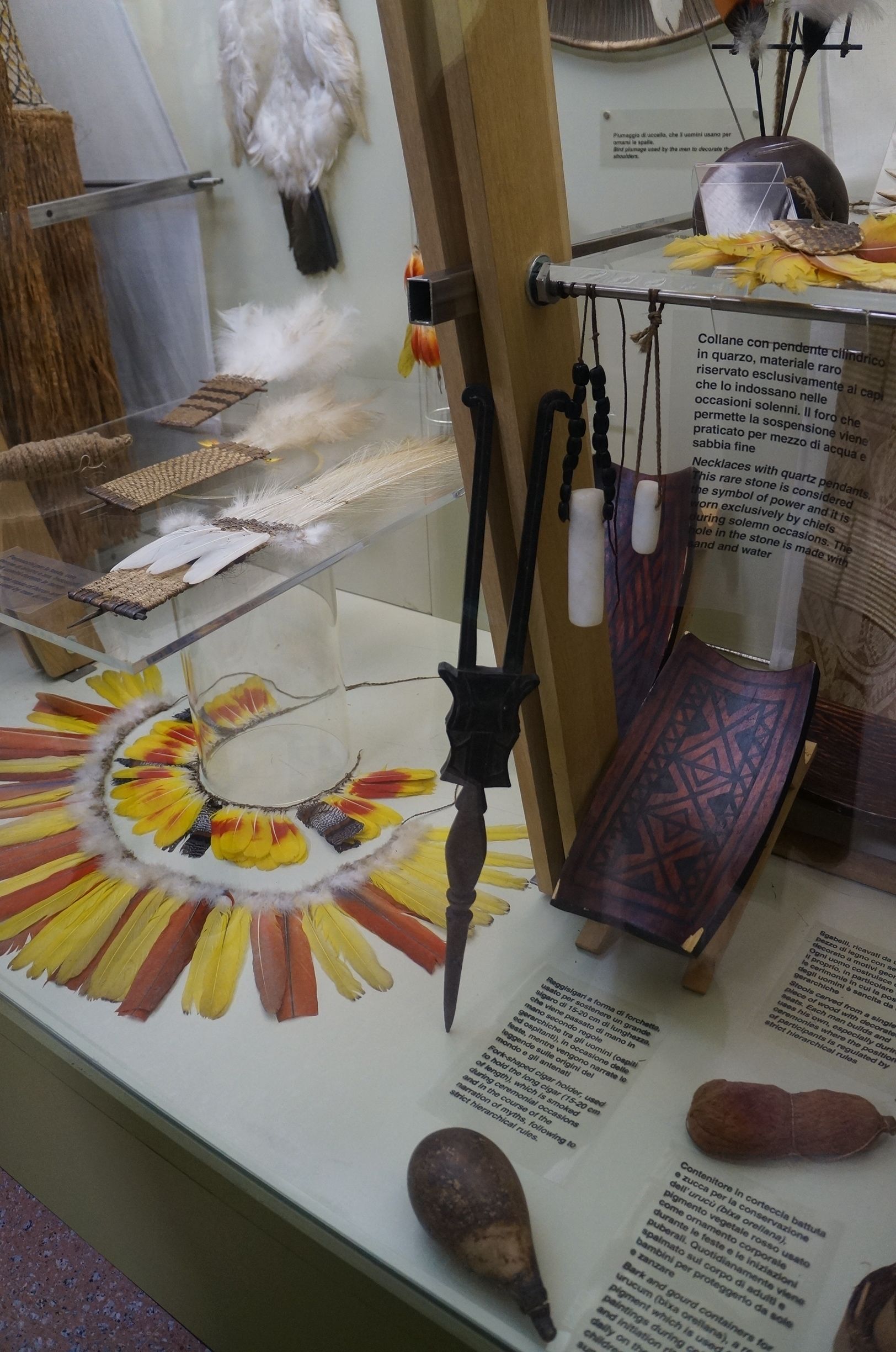 Shamanic objects in the permanent exhibition of the Ethnological Museum of Colle Don Bosco, in the province of Asti (Italy). From the left, two feather belts, a support for cigars, two quartz necklaces and one wooden stool, of exclusive use of one tìof the ritual specialists. Personal archive of the authors, October 2020.