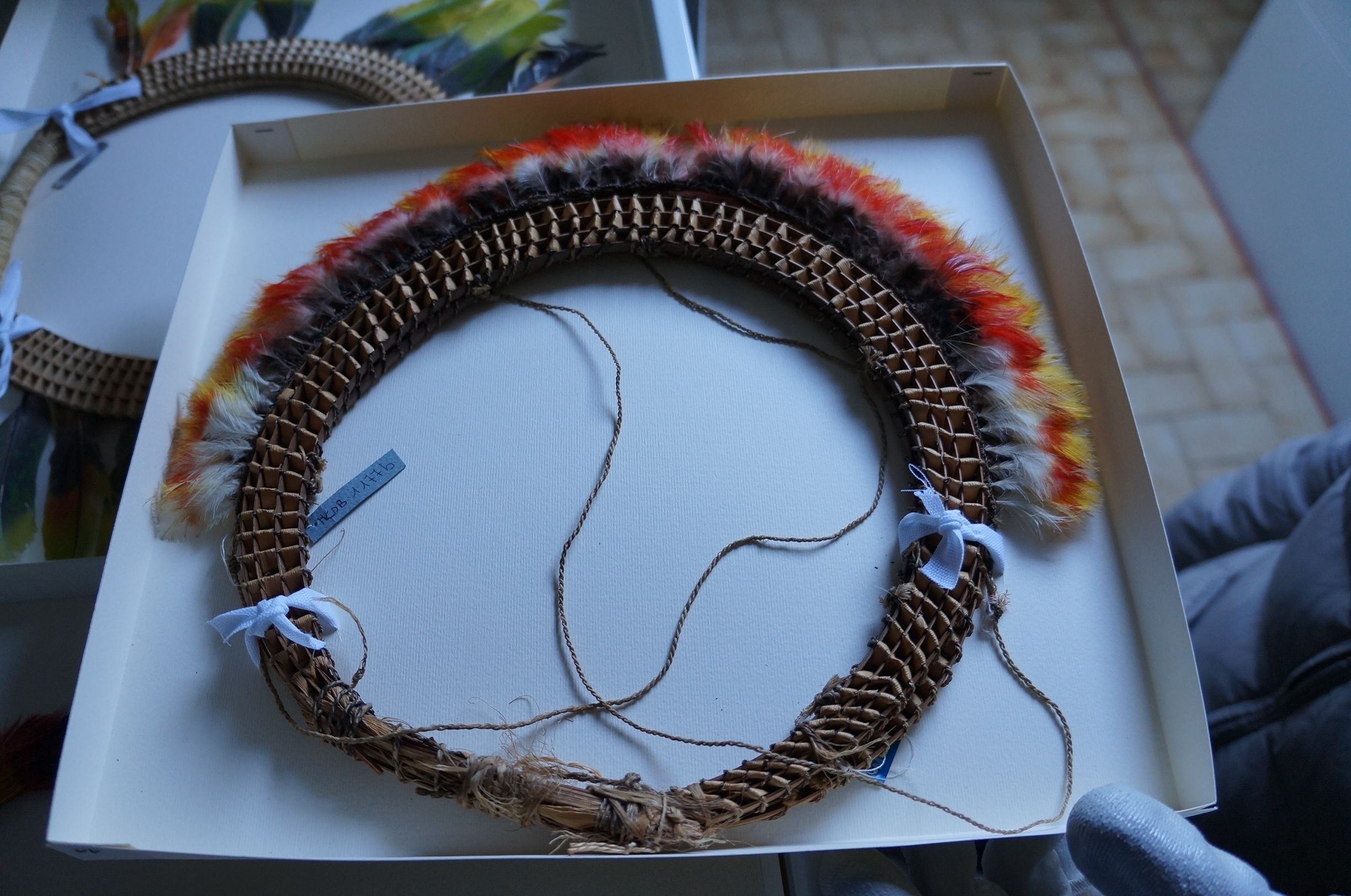 Headband belonging to the ritual specialist or, depending on the ceremonial context, one of his initiates. Plant fiber and toucan feathers. Preserved at the Missionary Ethnological Museum of Colle Don Bosco, in the province of Asti (Italy). Personal archive of the authors, January 2020