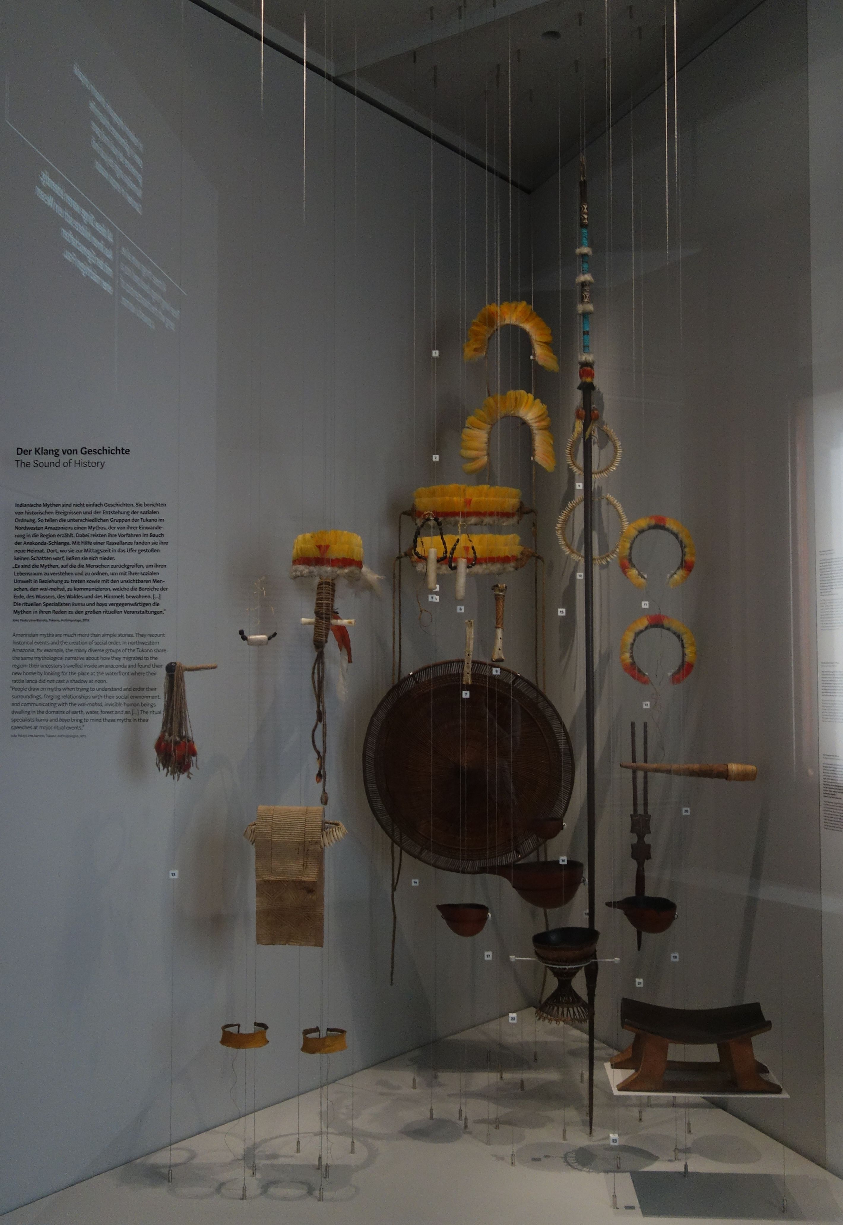 Exhibition case at the Welt Museum of Vienna showing artefacts from the Rio Negro related to the creation of the world. Personal archive of the authors, October 2020.