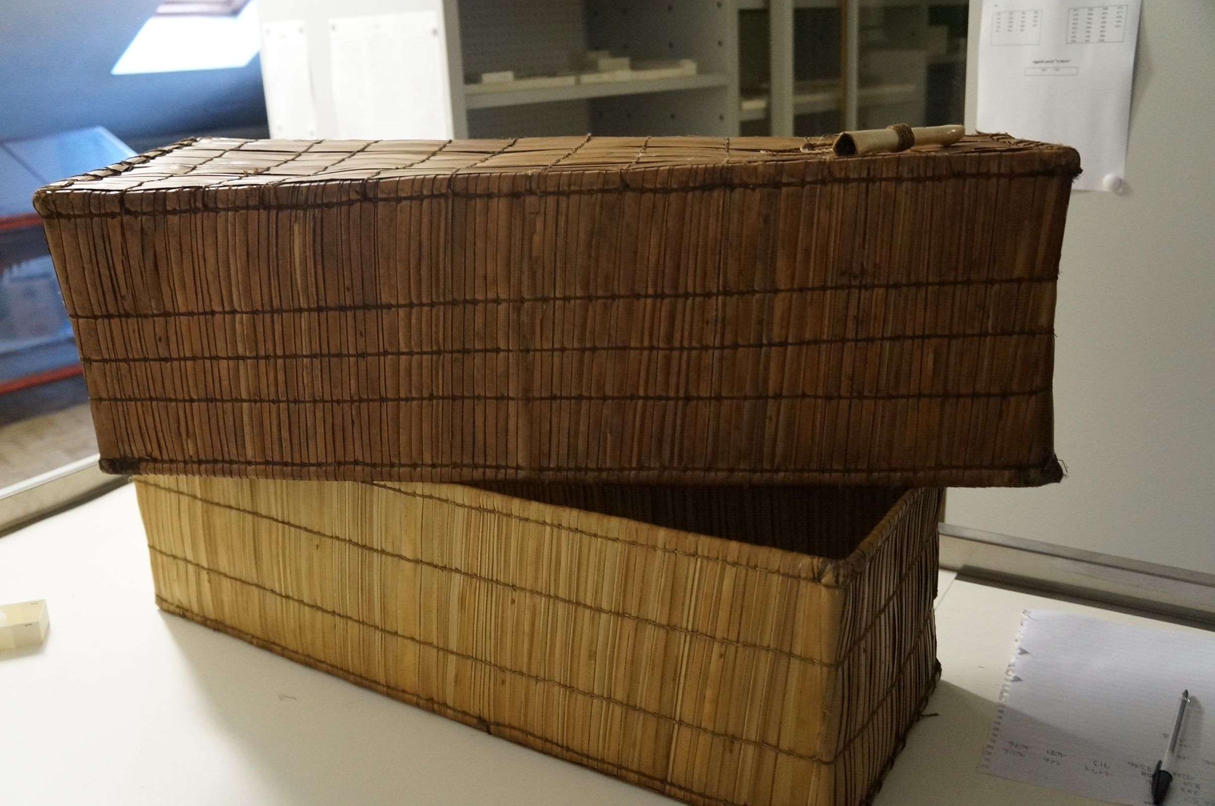 A shamanic wicker chest, also known as the “chest of humanity,” originally containing the dancers' entire suit. It was kept suspended inside the great house of knowledge and could only be opened by its guardian on appropriate occasions. Preserved at the Missionary Ethnological Museum of Colle Don Bosco, in the province of Asti (Italy). Personal archive of the authors, October 2025.