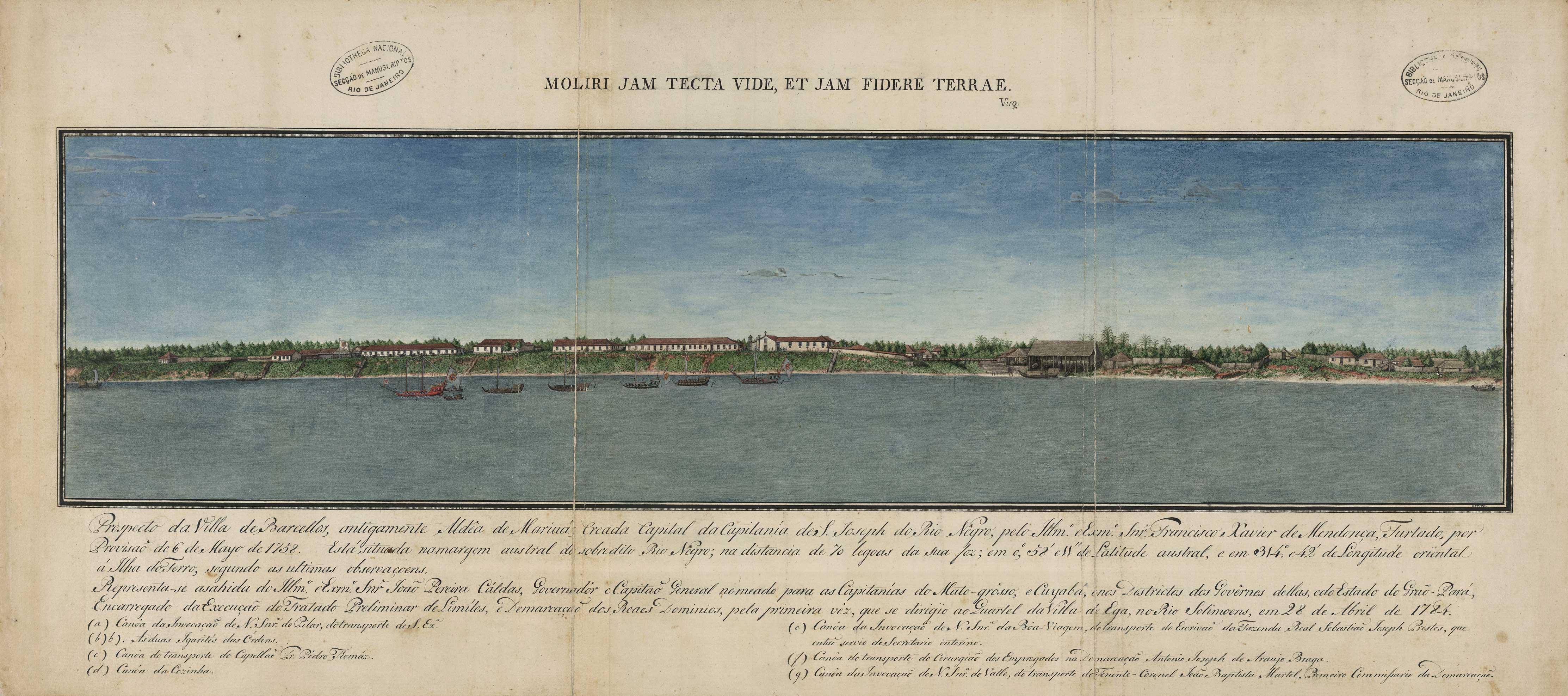 View of the town of Barcelos, capital of the Captaincy of São José do Rio Negro. Drawing made during the Viagem Philosophica led by the Portuguese-Brazilian naturalist Alexandre Rodrigues Ferreira between 1783 and 1792. National Digital Library of Rio de Janeiro.