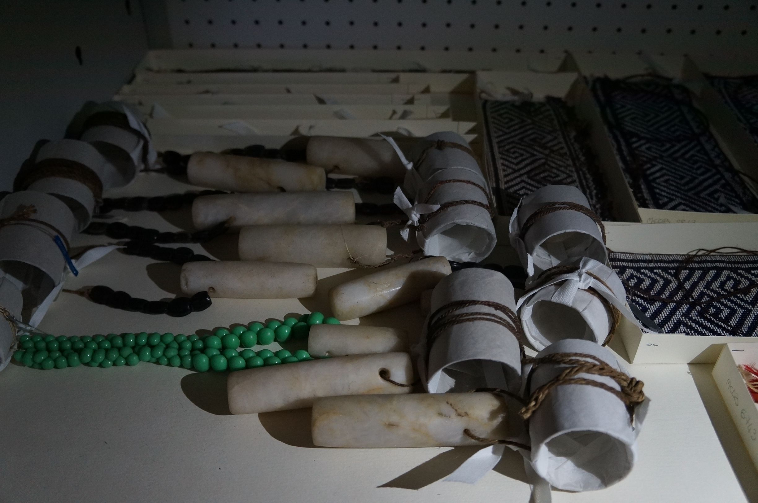 Storage cabinet shelf containing shamanic quartz necklaces from Rio Negro at the Ethnological Museum of Colle Don Bosco, in the province of Asti (Italy). Personal archive of the authors, January 2020.